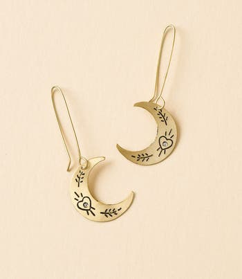 The Ruchi Collection features new age motifs in dainty gold or silver tone on brass settings with a delicate cubic zirconia accent. The Ruchi Crescent Moon Gold Dangle Earrings for women are intricately etched with ferns and a radiating heart with a tiny cubic zirconia studded in the center of the heart. The moon represents the divine feminine energy.