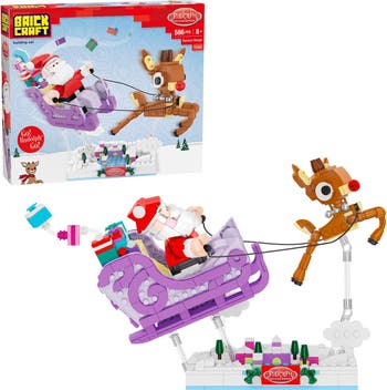 Rudolph leads Santa's sleigh in this festive brick-built holiday scene, complete with his glowing red nose and mid-flight pose. Santa sits in a purple sleigh packed with gifts, while clear supports and a snowy base give the illusion of soaring through the sky. With printed details and playful touches, this nostalgic build makes a magical holiday centerpiece for mantels, desks, or shelves.