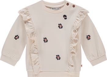 This cream-toned pullover crewneck sweatshirt features embroidered leopard print accents and ruffled embellishments on each side of the bodice.