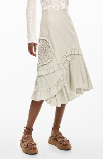 Crisp frills enhance the romance of this flared midi skirt cut from crisp cotton and finished with a swingy ruffled hem.