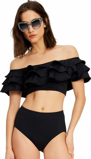 Resort ready ruffles! The Kate Spade Ruffle Bra Top is subtly sexy with an off the shoulder neckline. Mix and match with bikini bottoms or style it with a high waisted skirt for an effortlessly cool option.