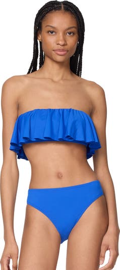 A solid bandeau bikini top for minimal tan lines and maximum style. A flirty ruffle along the front and back adds a fun statement, no matter which way you're headed. Add the strap for support. Pair it with a solid or printed bottom.