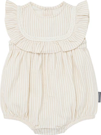 Let your little one play and explore in this delightful baby girl bubble romper! Made from 100% cotton, it’s gentle on her skin while keeping her cool on those sunny days. The convenient leg snaps mean easy dressing and diaper changes, while grippers help keep everything in place during play. With adorable ruffles across the bodice and cute faux wood buttons on the back, this one-piece is perfect for fun-filled, warm-weather days! Our essentials have been independently certified with STANDARD 100 by OEKO-TEX® so that you don’t have to worry about harmful substances in your baby’s wardrobe. Pack includes one romper.