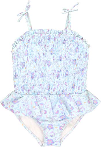 A frilly peplum and dainty bow sweeten this smocked one-piece swimsuit complete with built-in sun protection for your little sun chaser.
