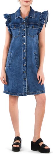 Frilled sleeves create volume and charm on this stretch-denim dress made in a classic faded wash.