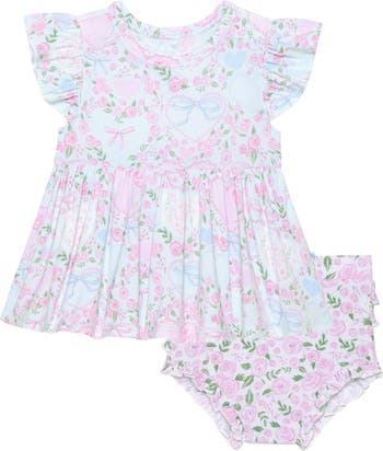 Supersoft and trimmed in playful ruffles, this cap-sleeve dress and coordinating bloomers will have baby looking ready for playdates and parties alike.