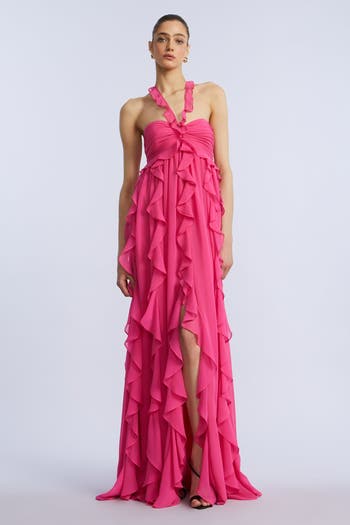 Flamenco-inspired halter gown in bright pink chiffon, detailed with sculpted ruching and cascading ruffle trims. Designed with an adjustable tie at the neck and a front slit, the full-length silhouette floats with movement. A playful pick for destination weddings, milestone birthdays, or a gala that calls for a little twirl.