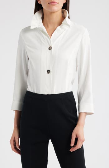 Modern polish defines this longline crepe de chine shirt designed with a romantic ruffled collar.