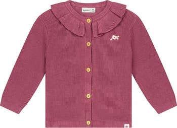This purple-toned knit cardigan features a ruffled collar, flower patch enhancement, and button enclosures.