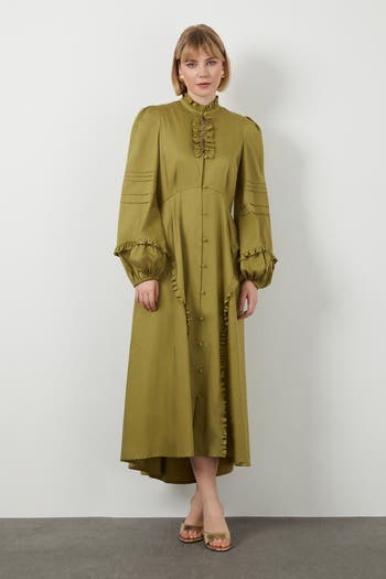 Perfect for fall and winter, this midi-length, flared-frilled dress features a frilled collar, long ruffled sleeves, and a buttoned closure. It comes without pockets and offers a standard fit. Unlined for a lightweight feel, it measures 135.8 cm in length. The model, who is 177 5'10" tall with a 32.7" bust, 23.6" waist, and 35.4" hips, is wearing size 36.