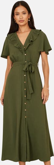 An easy and flattering fit for the new season in this shirt dress from Yumi. The super cute frill collar is framed with fluttery angel sleeves. The midi length with full button down fastening, is completed with a tie belt at the waist. Wear for dinner invites or meeting friends.