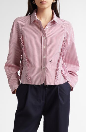 Unexpected ruffles and raglan sleeves innovate a cotton button-up shirt embroidered with a signature spiralling logo.