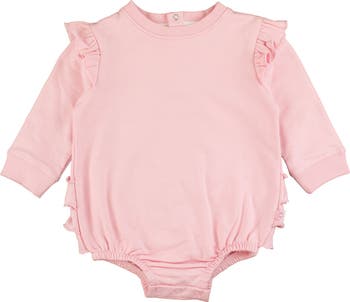 This cutie-pie cotton sweatshirt romper features a bubbly silhouette and signature rear-end ruffles that repeat at the shoulders.