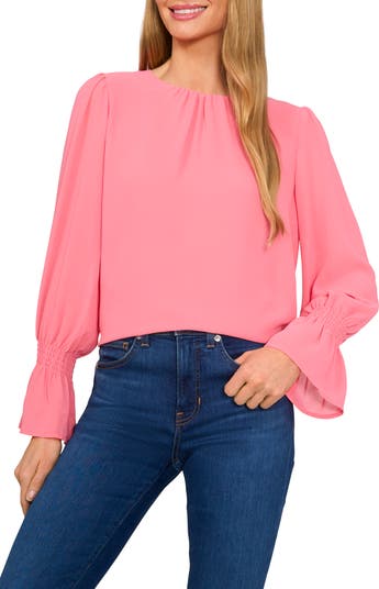 Long sleeves with fluttery ruffled cuffs elegantly frame this gauzy georgette top featuring light gathering at the neckline for a look that effortlessly takes you from the office to a chic dinner date.