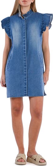 Crisp ruffles bring movement and texture to this denim dress cut in a leggy length and kissed with a touch of comfortable stretch.