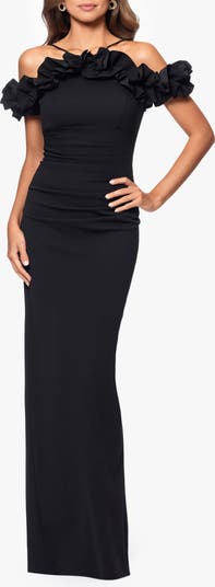 A festive froth of ruffles adds playful elegance to a curve-skimming gown cut from soft stretch crepe and eased with a back slit.