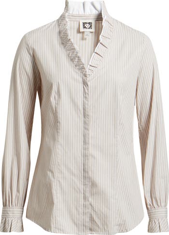 Dainty ruffles defining the neckline and sleeve cuffs of a striped cotton button-up take the staple to a sweeter place.