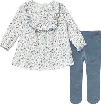 This baby girl dress set brings softness and charm to cooler days. Made from soft cotton with long sleeves for extra warmth, the dress features delicate smocking across the bodice for a flexible, comfy fit. A ruffled detail adds a playful finish, while the pull-on style makes dressing easy for busy mornings. The matching footed tights include a comfort-stretch waistband to keep her snug and cozy all day. Effortless, elevated, and made for everyday sweetness. Our essentials have been independently certified with STANDARD 100 by OEKO-TEX® so that you don’t have to worry about harmful substances in your little one's wardrobe. Pack includes matching dress and tight set from modern moments™ by Gerber®®.