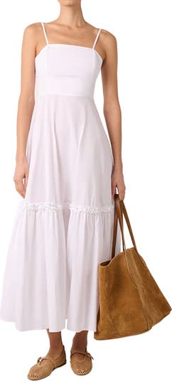- This cotton poplin dress has a fitted bodice featuring princess seams, a smocked back panel with an invisible zip closure. The spaghetti straps are decorated on the back with tiny bows and a ruffled tier details the flowy skirt, which sweeps wide and falls to a midi length.