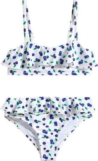 This kids’ two‑piece swimsuit features a cute allover print with playful ruffle trim, creating a fun and charming look that’s perfect for beach days and poolside play.
