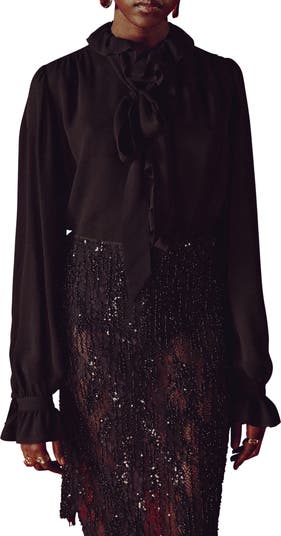 Fluttering frills romance this blousy front-button shirt framed by billowy sleeves and ruffled cuffs.