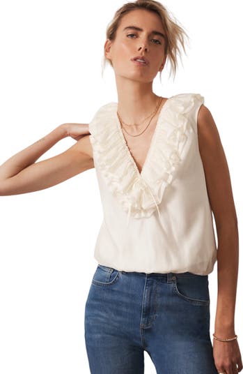 Cream tone sleeveless top with a V-neckline, ruffle trim, blouson elasticated hemline with a tie fastening through the front.
