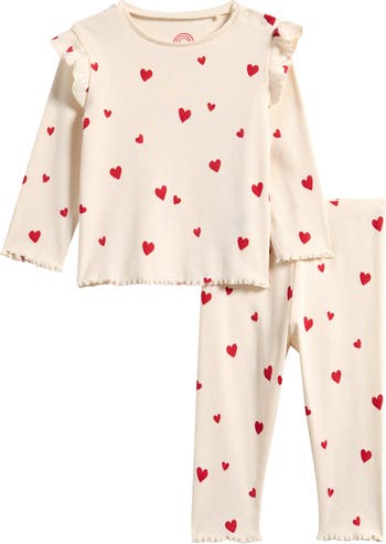 An assortment of red hearts bring the look of love to this ribbed set that pairs a ruffled-sleeve top with matching pants.
