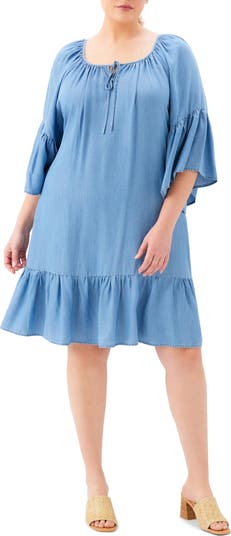 Breathable chambray and ruffled accents dreamily define a lightweight dress perfected with handy pockets and a slender tie at the neckline.