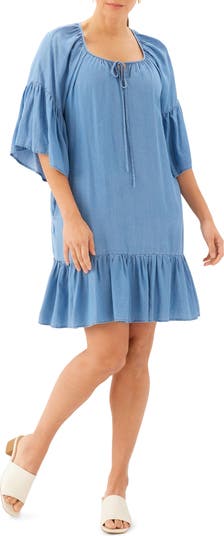 Breathable chambray and ruffled accents dreamily define a lightweight dress perfected with handy pockets and a slender tie at the neckline.