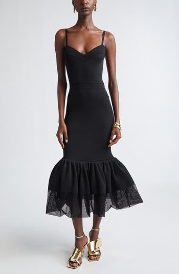 A bubbly tulle-trimmed ruffled hem adds playful counterpoint to the sleek body-con silhouette of this rib-knit tank dress designed with a strappy, open-back bodice.