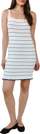 Allover ribbing adds texture and a close fit to this soft knit dress finished with a fanciful frill.