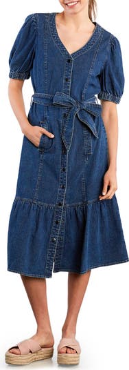 Puff sleeves and a frilled hem sweeten the silhouette of this denim midi made with a defining tie belt.