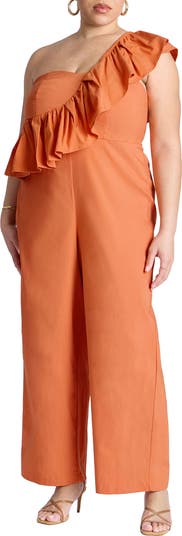 A luscious diagonal ruffle flutters gracefully on this crisp stretch-kissed jumpsuit made in a shoulder-baring silhouette and finished with leg-elongating wide hems.