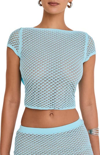 Airy open stitching pops against a mesh lining on this open-back top trimmed with frothy ruffles and knit to a cute abbreviated length.