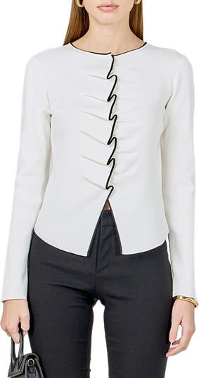 A polished knit with a playful twist, this long-sleeve button-up top is framed with contrast tipping. A ruffle at the center adds charming dimension, while the cutaway hem and streamlined silhouette keep the look refined.