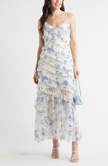 Floaty diagonal frills enhance the fluttering movement of this figure-skimming maxi textured with lovely lace.