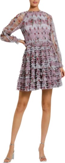 Playful and chic, this lilac floral mini dress features sheer sleeves and layered ruffles—perfect for brunches, parties, or standout day events.