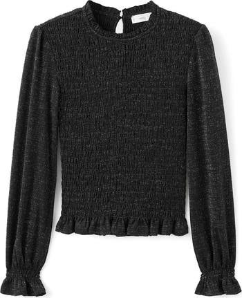 Fluttering frills romance this shimmering top framed by allover smocking and ruffled cuffs.
