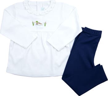 Our Ruffle Mallard Play Set is the perfect pant and shirt set for your toddler girl. Meticulously hand embroidered with an intricate mallard duck design. Buy now to have it on hand for the fall and winter seasons. The detail on this set is stunning and makes the perfect gift. Heirloom quality made with the utmost care. This Ruffle Mallard Play Set is comfortable enough to play in, and elegantly designed to wear for all occasions. Made of 100% Pima Cotton with a snap closure at the neck. The perfect gift to give your favorite baby and to also receive!