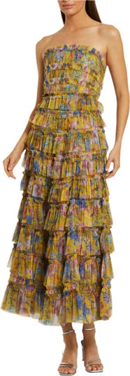 Strapless floral mesh dress with ruffle details and full lining—feminine, fresh, and perfect for weddings, parties, or spring events.