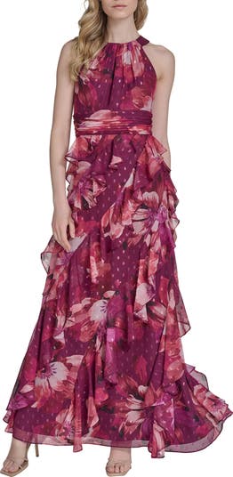 Floaty ruffles bring volume and graceful movement to this shimmering chiffon maxi centered with a pleat-trimmed waistline to shape the silhouette.