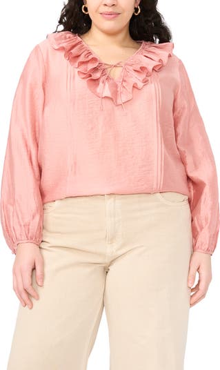 Cut from glossy hammered satin, this blousy V-neck top is romanced by fluttering neckline frills.