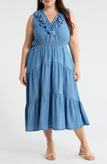A smocked waist sweetens the silhouette of this soft chambray midi made with fluttering frilled neckline and a flouncy tiered skirt.