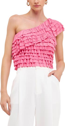 Highly detailed pleats dance along each ruffle of this artuflly tiered top that elegantly shows off your shoulders.