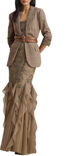 Swirling beadwork enhances the enchantment of this figure-sculpting gown topped with slinky straps and finished with floaty tulle ruffles.