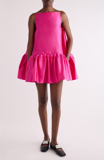 This vibrant hot-pink minidress cut from luminous silk satin achieves a bouffant effect with the A-line shape and voluminous ruffled hem.
