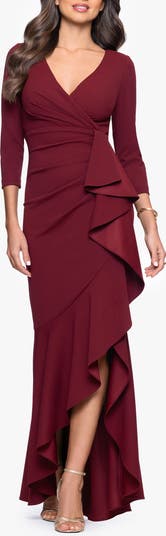 Made for making luscious-looking ruffles, scuba crepe is the ideally structured, stretchy fabric for this mermaid gown styled in a faux-wrap, high-low design.