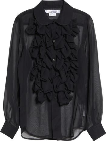 Cascading opaque ruffles and a Peter Pan collar sweeten this sheer crepe button-up shirt, capturing Rei Kawakubo's thoughtful push-pull between prim and playful.
