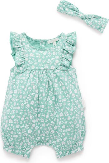 Our pretty Ruffle Shortie Romper & Headband Set is perfect summer outfit for your little one! Featuring a sweet romper with an all over floral print and ruffle details. Add an extra sweet touch with the matching knot headband. Made from 100% Cotton for a soft and breathable outfit.