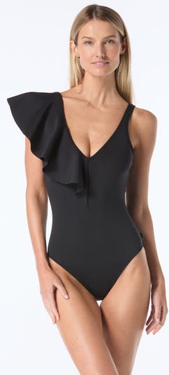 A cool one-piece swimsuit with a statement ruffle strap for an asymmetrical style. Crafted from sculpting scuba fabric, it smooths and embraces your curves for a flawless fit.